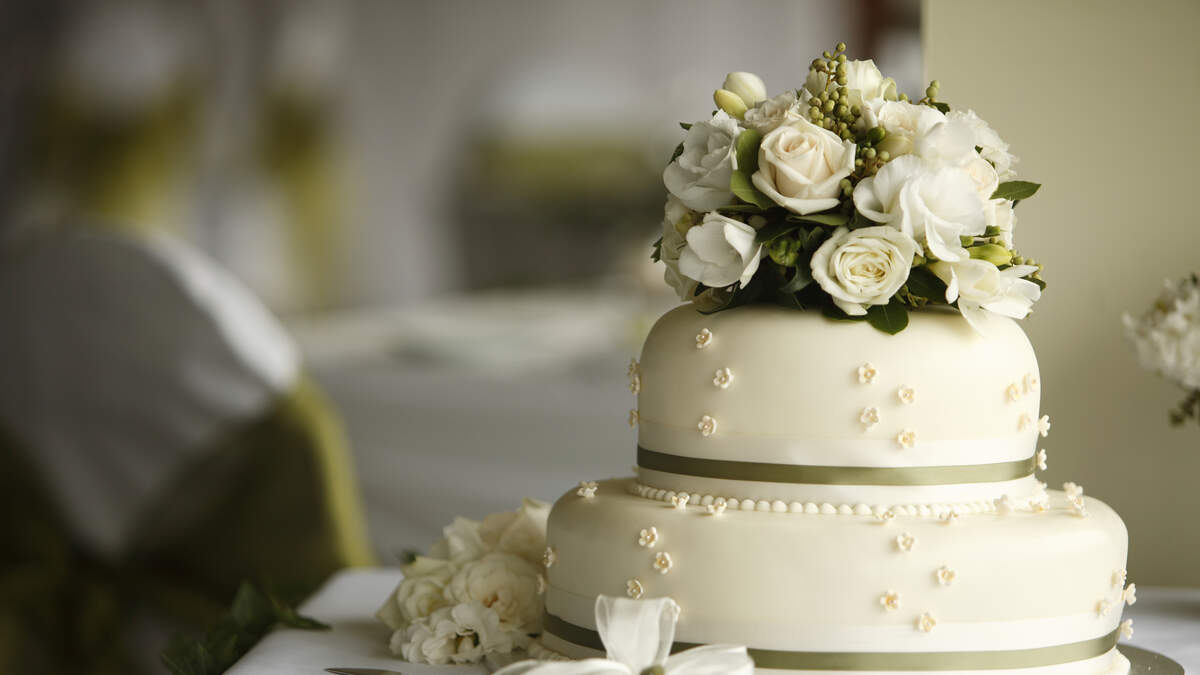A waiter pouring champagne for the happy couple at their wedding tries to show off some tricks by spinning and slamming the bottle down on the table but ends up toppling over the entire cake.